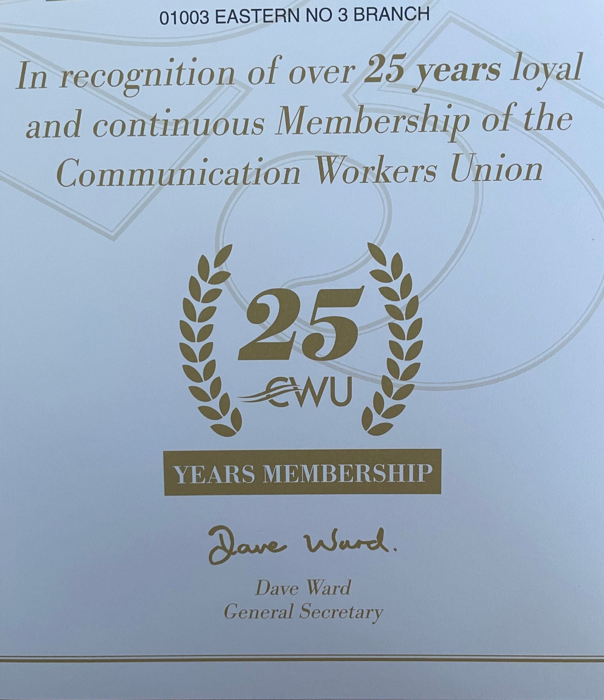 25 YEARS CWU MEMBERSHIP AWARD